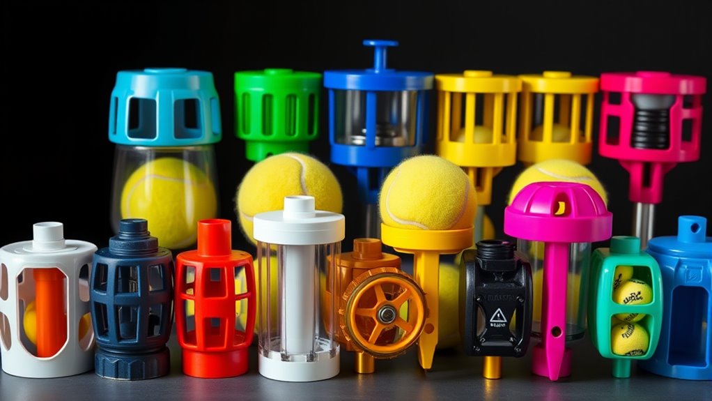 They can handle both practice and tournament balls, but it matters how you set them up. You’ll want feeders with adjustable wheel hubs or ball-sleeves that grip varied sizes without jamming. Start with practice balls to test feed smoothness, then switch to tournament-grade balls and tune feed rate.