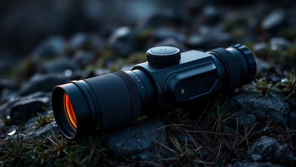 Make sure it’s dustproof and sealed tight against particles that could damage internal components during your hunts. Look for models featuring reinforced lenses and protective covers to prevent scratches and debris damage while you’re on the move. Furthermore, verify the operating temperature range suits your environment, typically between -20°C and 50°C, to ensure consistent performance no matter the weather you face in the field.