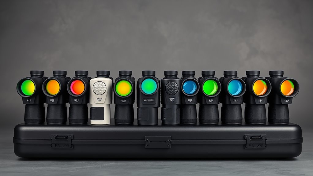 Consider weight and size to guarantee prolonged use won’t cause discomfort or imbalance on your helmet. Confirm the device’s mounting hardware can be adjusted or reversed for left or right eye configuration to suit your preference. Also assess bite-size adjustments for grip and tilt without tools, so you maintain stable aim while staying comfortable during extended missions.