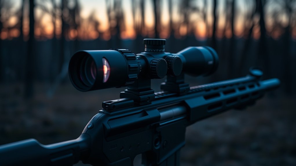 Whether you need a compact monocular or a long-range rifle scope, these options enhance low-light vision and target tracking like never before. Keep exploring to discover which scope fits your needs perfectly.