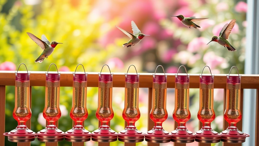 You’ll likely love top-fill feeders for their quick refills and fewer spills. Fun fact: studies show that feeders with wide-mouth tops reduce spill risk by up to 40% compared to narrow designs, saving nectar and keeping insects at bay. When you pick one, consider capacity, bee guards, and ease of cleaning.