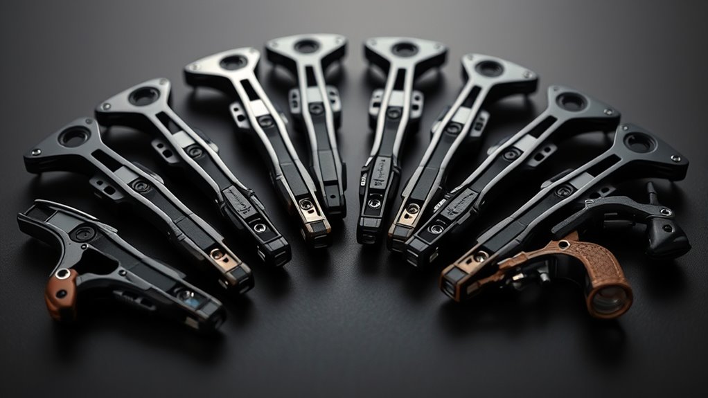 Many top-quality trigger releases for compound bows feature durable materials like aircraft-grade aluminum or steel, ensuring they stand up to intense use without faltering. When choosing your release, focus on corrosion-resistant materials to boost longevity, especially if you hunt outdoors where moisture and weather can take a toll. Strong construction reduces wear on moving parts, helping your trigger maintain consistent sensitivity and reliability over time.
