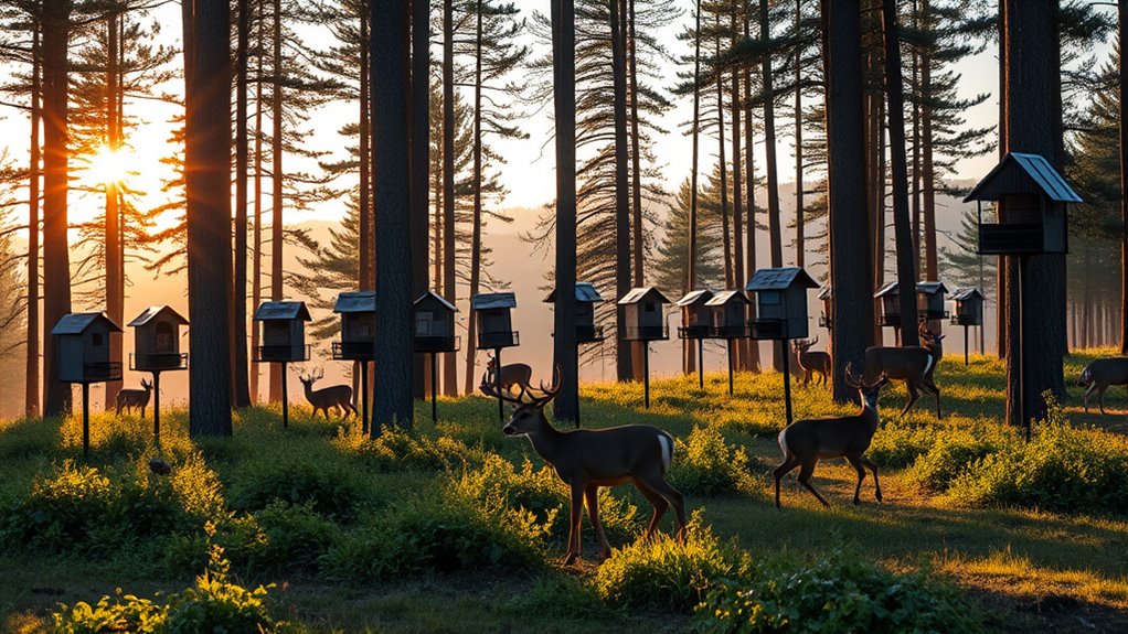 Consider your stand spacing and daily feeding rate, then choose a feeder that’s easy to refuel and weatherproof. You’ll stay efficient, legal, and covert if you plan ahead.