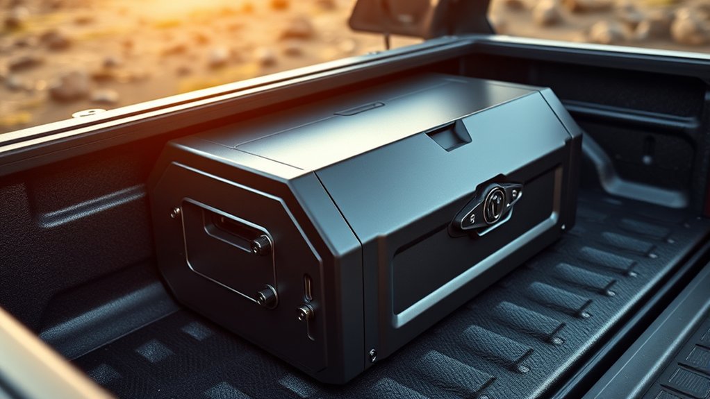 When choosing a truck gun safe, you’ll want to focus on the materials and build quality to guarantee it resists tampering and harsh conditions. Look for safes made from alloy steel or high-impact polycarbonate, as these materials ensure durability and resistance against forced entry.