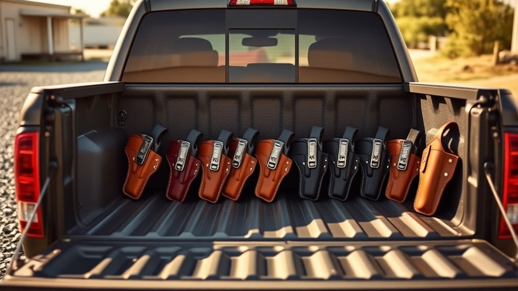 When choosing truck holsters for your Dodge Ram 2500, prioritize capacity and organization to keep tools ready and accessible without crowding the bed or cab. Start by evaluating storage capacity to make sure you can fit all necessary tools and accessories without overcrowding. Look for compartments, trays, or dividers that keep items separate and easy to grab.