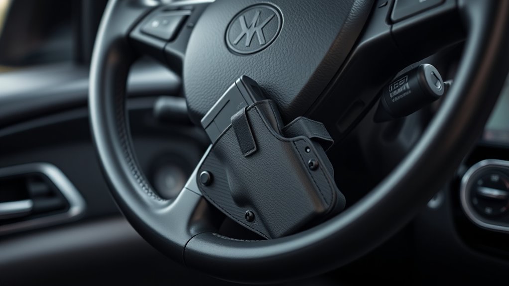 After verifying your holster fits your firearm perfectly, the next step is figuring out how to mount it securely under your steering wheel. You can choose from adhesive, screws, or adjustable straps, each offering different permanence and ease of installation. Adhesives work best on clean, smooth surfaces, while screws provide a more durable, long-term hold.