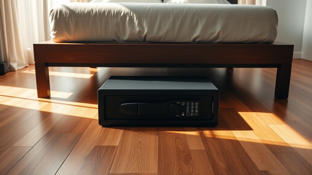 Also, evaluate the overall size and weight of the safe to guarantee it fits comfortably under your bed without making access difficult. Choosing the right storage capacity keeps your firearms organized, secure, and easily accessible when you need them.