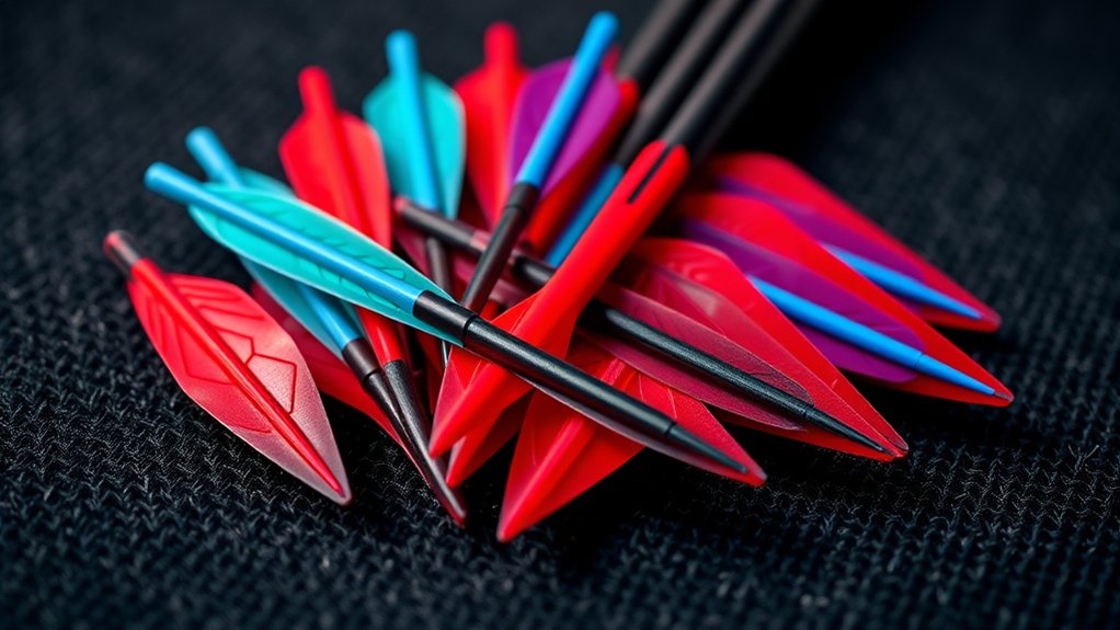 Wind-resistant features and aerodynamic profiles help stabilize your shot in various conditions. Selecting vanes that fit your shaft size and purpose guarantees reliable flight and longevity. Stick with trusted brands, and you’ll find even more tips below to enhance your setup.