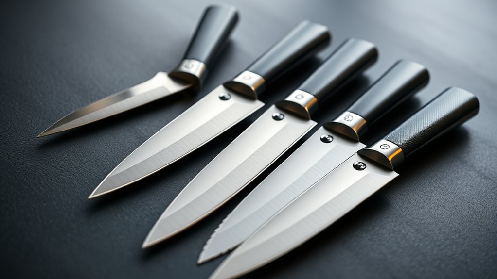 If you’re left-handed or want versatility, consider knives with reversible or ambidextrous handles to guarantee comfortable use regardless of your dominant hand.