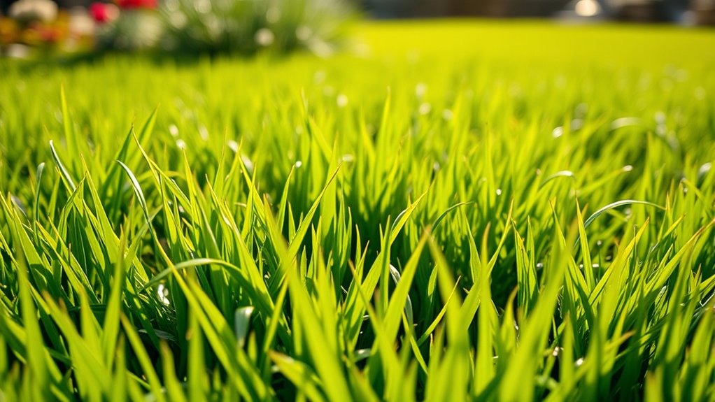 This resilience guarantees your lawn stays green and robust even when rainfall is limited. Prioritizing drought tolerance is a smart choice for sustainability and a lush yard that withstands tough weather without constant upkeep.
