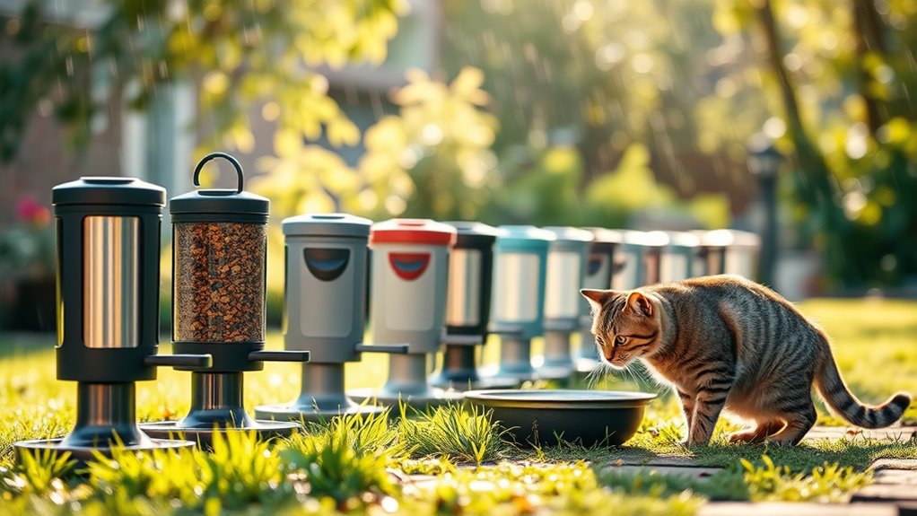 To protect outdoor feeders from predators, prioritize designs that keep food elevated, with sturdy, tamper-resistant construction. Elevated platforms deter ground-dwelling threats and help you monitor access. Look for dual entrances and escape routes so your cat can stay aware of its surroundings and move to safety quickly.