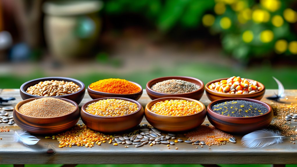 You’ll want to avoid mixes with fillers or dusty ingredients like corn because they reduce food quality and increase waste. Instead, focus on clean, natural blends that birds find palatable. Also, consider seasonal changes. Adding protein-rich seeds during breeding seasons supports birds’ nutritional demands year-round.