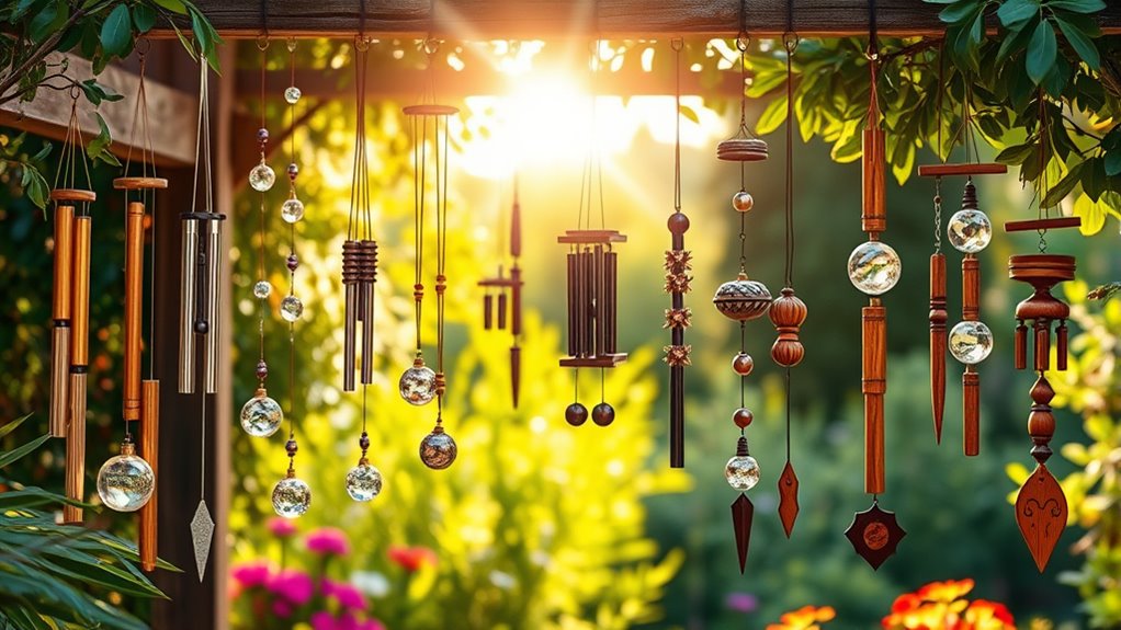 You’ll want wind chimes made from durable, weather-resistant materials like anodized aluminum or copper for lasting outdoor beauty. Look for ones tuned to soothing scales that create calming melodies, with sizes that fit your garden space perfectly.