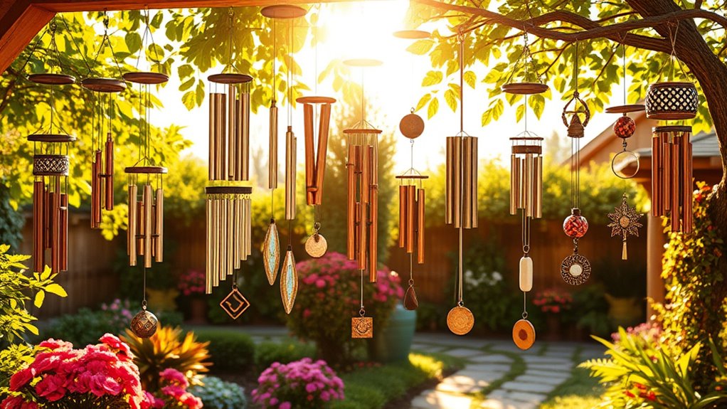 When you choose wind chimes for your outdoor space, prioritizing weather resistance guarantees they stay beautiful and functional through all seasons. Look for chimes made from anodized aluminum, treated wood, or powder-coated metal to resist rain, sun, and wind. Corrosion-resistant finishes like bronze, antique copper, or sealed paints prevent rust and deterioration over time.