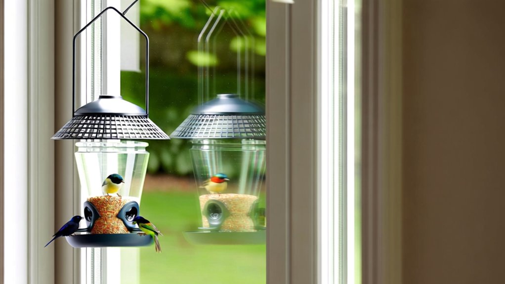 When you want to keep your window bird feeder inviting and safe for birds, ease of cleaning becomes essential. Choose feeders with removable trays so you can refill and clean them quickly without taking the whole feeder apart. Look for drainage holes or mesh trays that prevent water buildup and keep seeds dry, reducing mold risk.