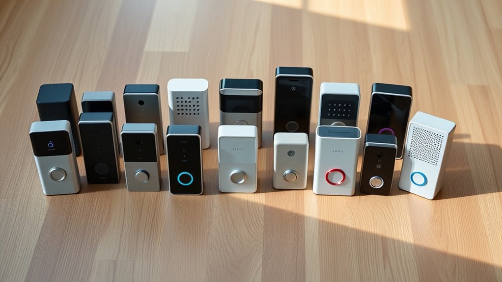 Some doorbells use rechargeable batteries, which can save money but require regular charging to stay operational. Also, look for weather-resistant, sealed designs—they protect internal components from moisture and temperature changes, helping maintain power source performance over time. By considering these factors, you’ll ensure your doorbell remains reliable, saving you the hassle of frequent maintenance or unexpected power failures.