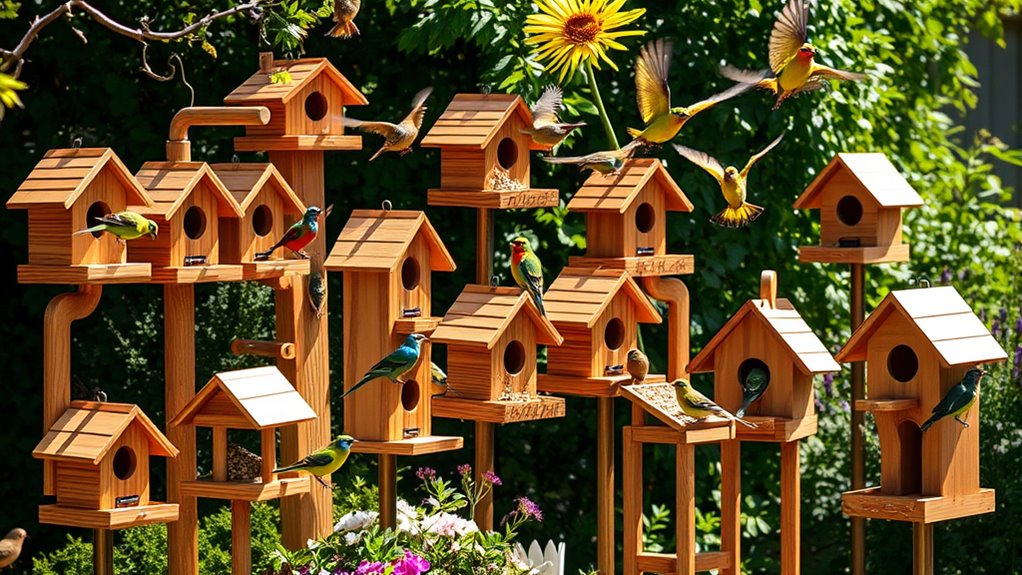You’ll want wood bird feeders made from durable cedar for natural pest resistance and weather protection. Choose designs with large seed capacities and multiple feeding openings to attract a variety of birds like finches, cardinals, and bluebirds.