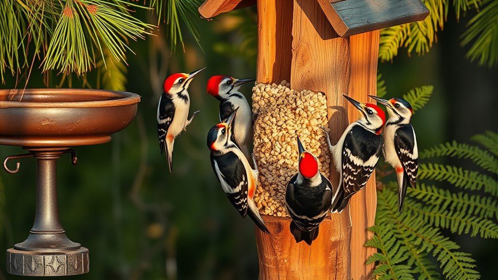Keep feeders in shade, away from predators, and rotate flavors to minimize mold growth—consistency keeps your woodpeckers happy.