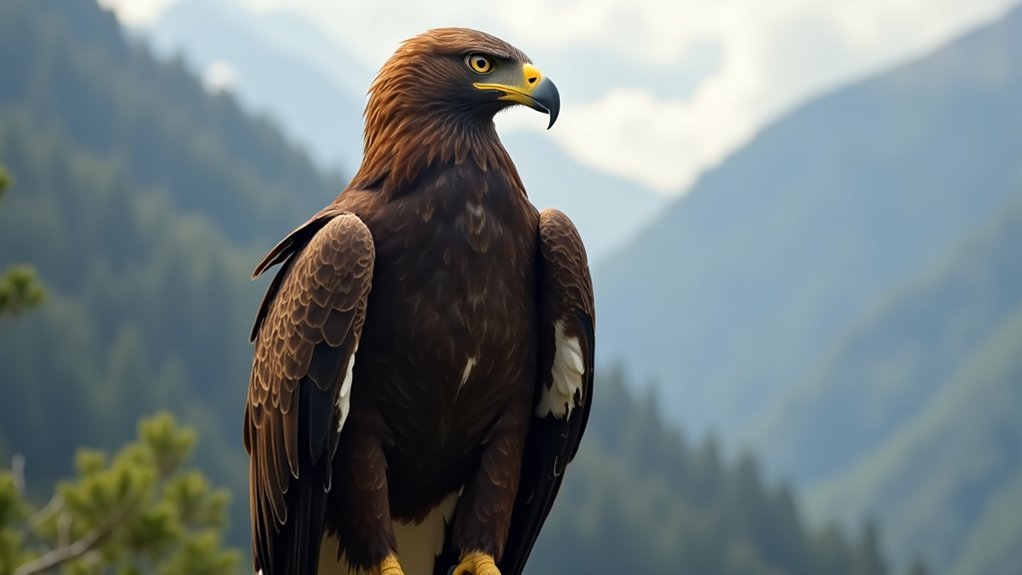 When spotting a golden eagle, keep in mind its wingspan can reach up to 7.5 feet, making it one of the largest raptors in North America. This impressive size, combined with its dark brown plumage and distinctive golden nape, helps you distinguish it from similar species.