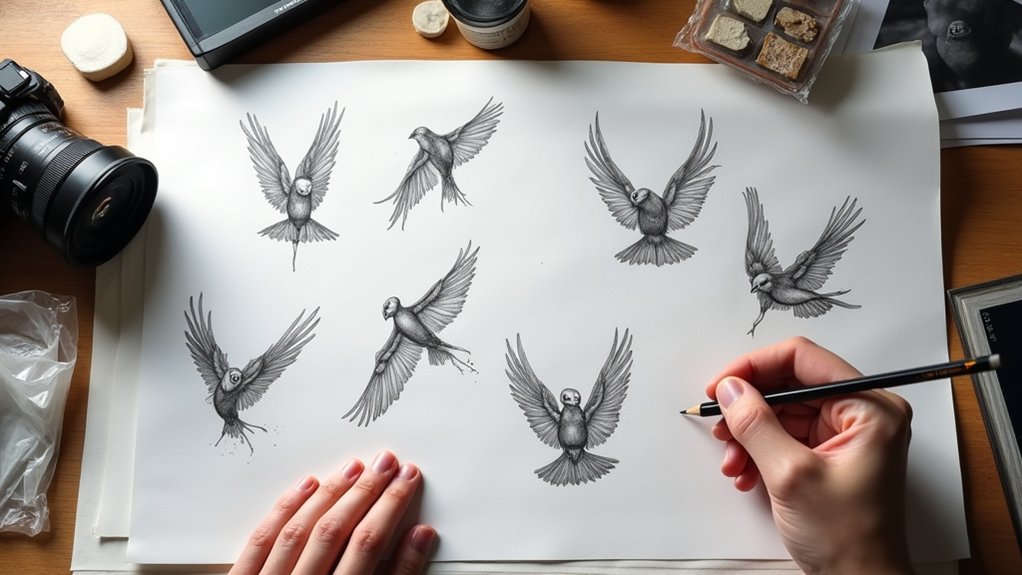 Blending stumps smooth tonal shifts, while proportional dividers guarantee accurate bird-to-wing ratios.
