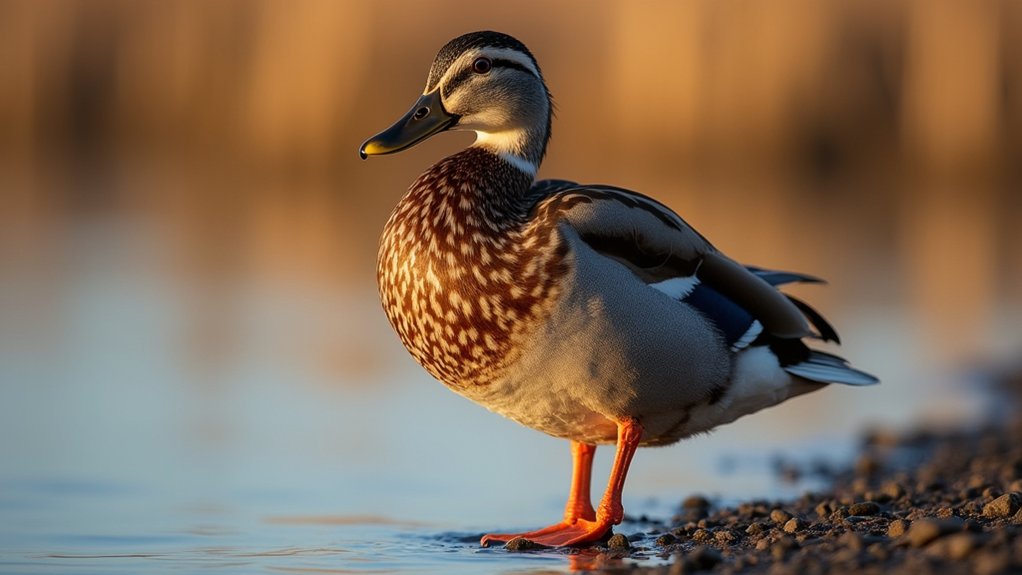 Moreover, white patches like the gadwall’s white speculum and pintail’s wing markings help you identify waterfowl and classify duck species accurately based on plumage color patterns.