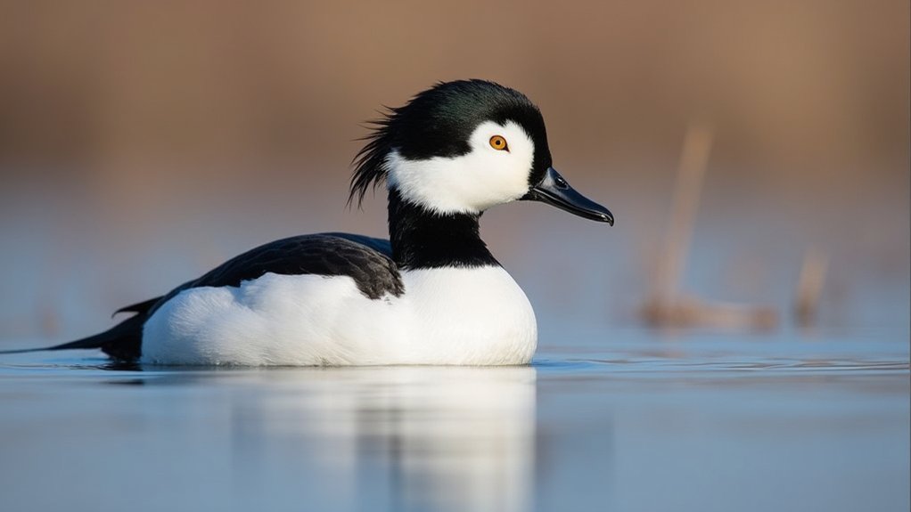 You’ll notice its serrated sawbill, a key adaptation for fish hunting, aligns it with mergansers, eiders, and scoters rather than seed-eating dabblers.
