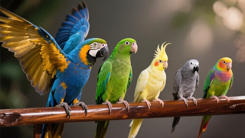 As you investigate the fascinating world of talking birds, you’ll find these five species: African Grey Parrot, Budgerigar, Indian Ringneck Parakeet, Yellow-naped Amazon, and Hill Myna. They are linguistic marvels, each a living lexicon.