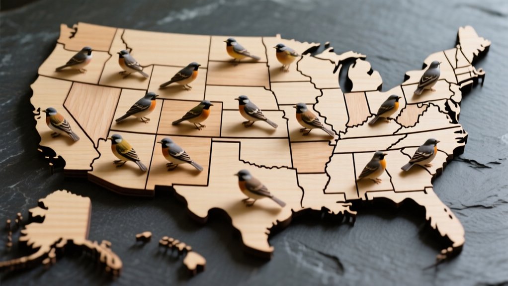 Many birds, such as the Northern Cardinal and Northern Mockingbird, serve multiple states yet reflect unique regional traits. Exploring further reveals fascinating adaptations and regional significance tied to these avian emblems.