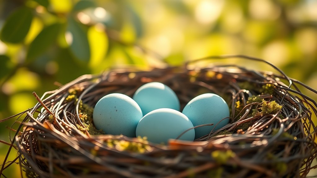Although the blue color of eggs primarily serves camouflage, it also sends a clear signal about the female bird’s health and genetic fitness. When you observe blue eggs, you’re seeing more than just pigmentation; these eggs convey important information about maternal quality.