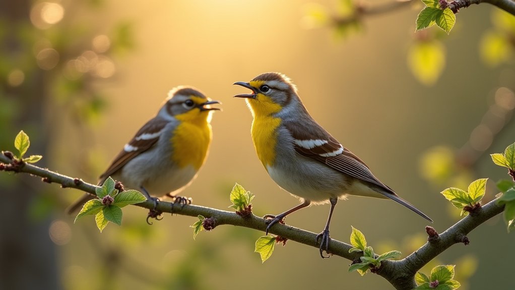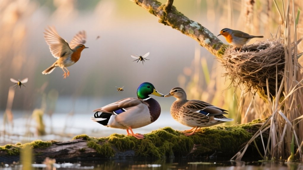 Although bird mating seasons are often linked to species-specific life histories, habitat characteristics play an essential role in shaping the timing and duration of breeding periods. You’ll notice forest birds breed with canopy leaf-out, matching insect peaks. Research shows that human modifications to habitats can significantly influence breeding pairs and mating success in urban bird populations, altering their evolutionary trajectories. Human-modified habitats affect bird mating patterns in complex ways.
