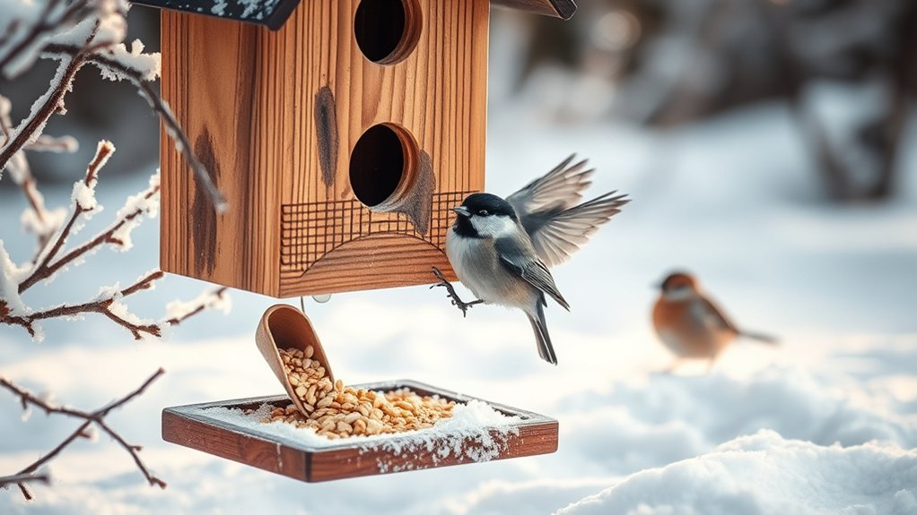 This strategy guarantees your winter bird feeding setup stays inviting and supports diverse bird populations.